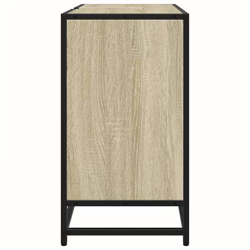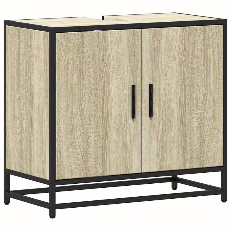 The Duo Cabinet Set includes two cabinets that work as a unified storage system. They can be placed together or separated to shape different bathroom zones. Oak-effect fronts blend with the black metal frame, forming a modern and tidy look. Both cabinets offer generous interior space for towels, baskets, cosmetics and care items. The top surface supports a sink and everyday objects. The set enhances the balance of the interior and forms a continuous style. It creates a smooth transition between bathroom areas.